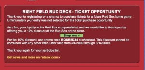 Again I have to say that I don’t get it. And I don’t just mean that literally. I mean I just don’t understand why it’s so hard to get Red Sox tickets. I’ve written in the past about the problems I’ve had on the general on-sale day. Well now I need to complain because for what feels like the third or fourth straight year, I’ve been shut out of even having the opportunity to buy tickets to Opening Day, the Yankee/Red Sox games, or tickets on the Green Monster or Right Field Bud Deck. If you don’t know, the Sox hold multiple separate raffles (all random, of course, ha ha), and winners don’t even get tickets to those games — they simply get the chance to buy tickets to those games. So yeah. After wasting a day in the Virtual Waiting Room and having no luck getting tickets, then you have to enter your name in the drawings and wait to see if you’ll be selected. And yes, that’s right. Not only didn’t I get tickets, I didn’t even get the option to buy tickets. And again, this is the third or fourth year in a row that I didn’t make it through to a single one of those ticket-buying opportunities. What the fudge! How rigged is this ticketing system?! Am I ever going to get through? I’m getting tired of only seeing games in Florida or only going to Fenway for concerts.