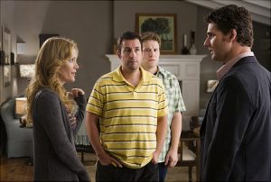 In the film, George Simmons (Adam Sandler) is a successful comic actor (and the star of such low-brow films as MerMan and Re-Do, the latter featuring his head on an infant’s body), who learns he has a rare terminal blood disease. Depressed, lonely, and vulnerable, he starts to lash out on stand-up stages.