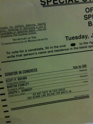 As I filled in the box next to Martha Coakley’s name on my ballot tonight, I thought about how sad this election was. Ted Kennedy, the man who held this Senate seat for so long and who did so many great things for this country and the state of Massachusetts, didn’t deserve for his successor to be chosen by people like myself who aren’t committed to the candidate and are merely voting along party lines out of obligation more than anything else. People who are so annoyed by the calls and the ads that they’re voting against a candidate more than they are for a candidate.