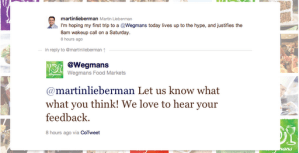 […] (you guessed it) social media. One blogger documented his first experience at a Wegmans on Twitter (on his own blog) and he had the following to […]